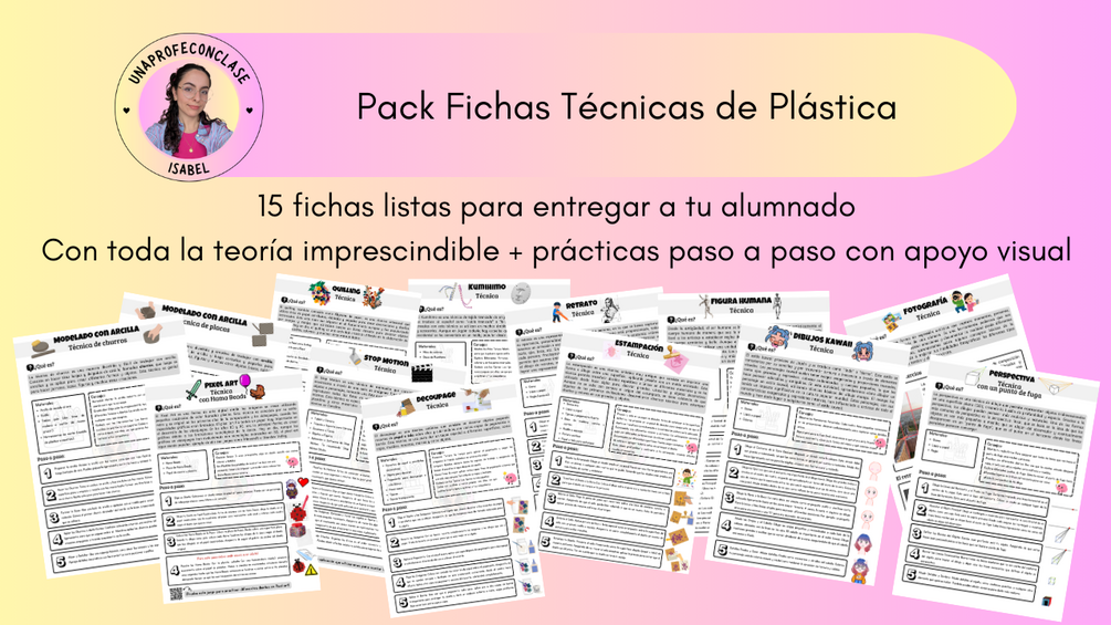 Un pack con 15 fichas listas para entregar a tu alumnado. Podrás trabajar +10 técnicas diferentes dentro del aula